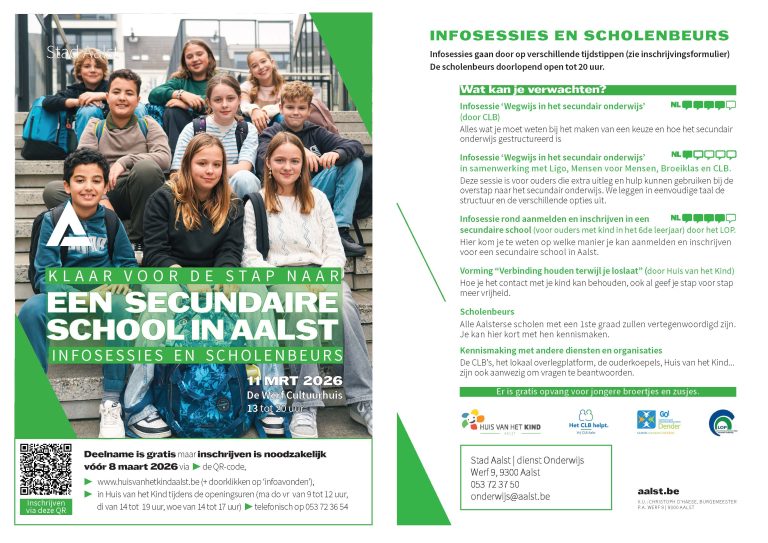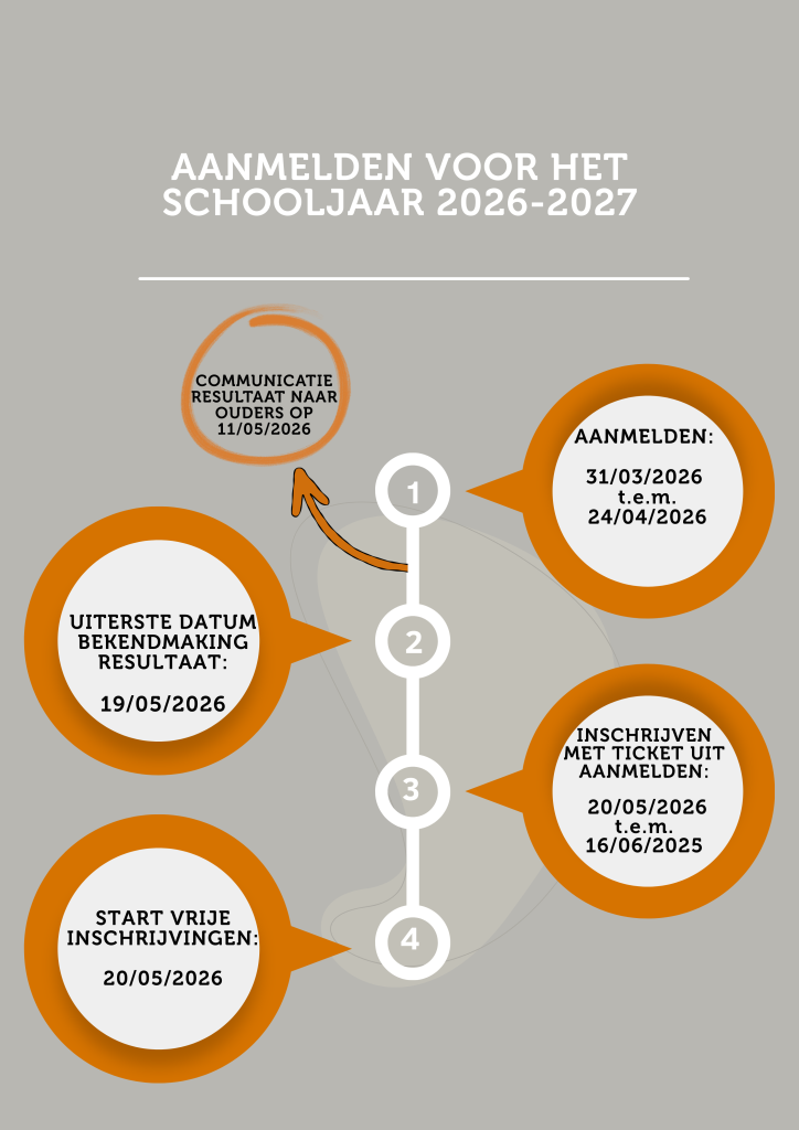 Alle leerlingen die volgend schooljaar (2026-2027) starten in het 1ste jaar secundair onderwijs (1A of 1B) melden zich vanaf 31 maart aan via de website naarschoolinaalst.be. Op 11 mei krijgt u een bericht (ticket) met de toegewezen school. Over de manier van inschrijven, communiceren wij later via onze website.